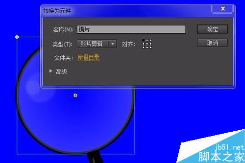 六、選中放大鏡的玻璃部分,轉換為影片剪輯元件,命名為“鏡片”。然后在放大鏡元件里把鏡片刪除。