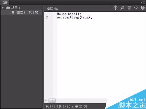 另一種做法,是用代碼指令,但是這樣就要把“放大鏡”元件刪除不用,也就是說圖層四刪除。這幾個圖層也不用延伸到100幀,分別都是1幀即可。然后在圖層三(即為遮罩層)的元件“鏡片”設置實例名稱為mc。