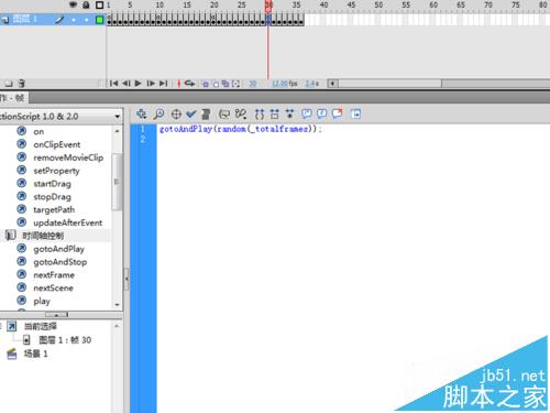 8、選擇第一、十、二十、三十幀,按f9鍵打開動作面板,分別輸入代碼“gotoandplay(random(_totalframes))”腳本。