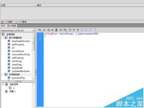 9、新建一個名稱為a的影片剪輯元件,確定后進入編輯區域,在第一幀處把影片剪輯z拖拽到舞臺上,并在動作面板中輸入
