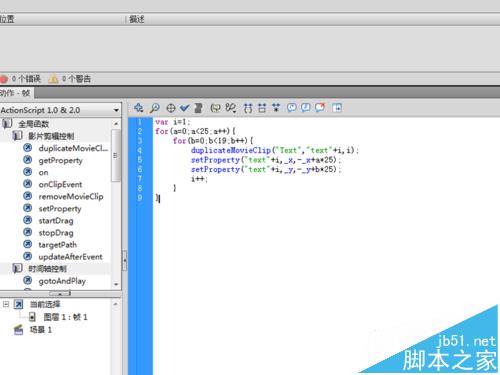 10、選擇影片剪輯元件z,修改其實例名稱為text,選擇第一幀按f9進入動作面板輸入代碼