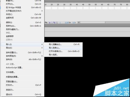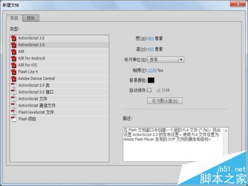 1、啟動flash cs5,執行文件-新建命令,新建一個基于actionscript2.0,大小為800*600,幀頻為12fps,背景顏色為黑色的文件。