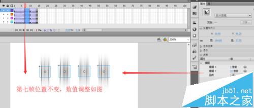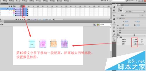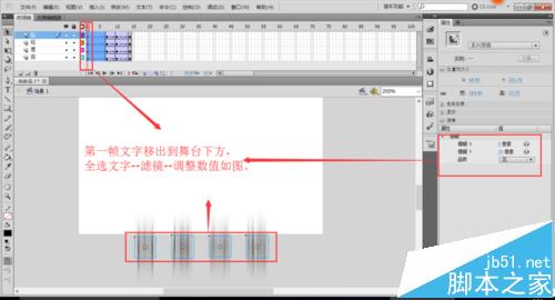 3、第一幀文字移出到舞臺下方,全選文字--濾鏡--調整數值如圖。