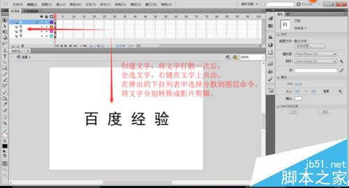 1、創建文字,(可從網上下載自己喜歡的字體。)將文字打散一次后,全選文字,右鍵在文字上點擊,在彈出的下拉列表中選擇分散到圖層命令。將文字分別轉換成影片剪輯。