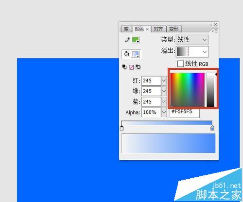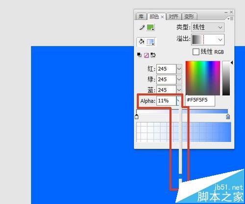 6、點(diǎn)擊alpha的下拉箭頭,在出現(xiàn)的滑桿上拖動(dòng)可更改該色標(biāo)顏色的透明度,拖動(dòng)的同時(shí),下方顯示欄中的顏色會(huì)即時(shí)出現(xiàn)改變后的預(yù)覽。也可以在輸入框中直接輸入數(shù)值。