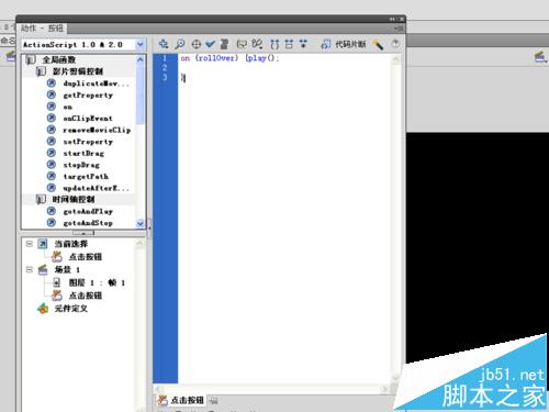 10、選擇圖層1的第一幀處選擇舞臺上的“點擊按鈕”元件,打開其動作面板,在其中輸入代碼為:on(rollover){play();};