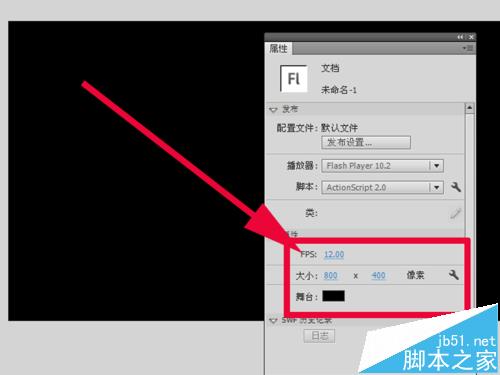 1、啟動flash cs5,執行文件-新建命令,新建一個基于actionscript2.0的flash文檔,設置其大小為800*400,幀頻為12fps,背景顏色為黑色。