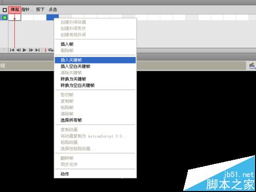 7、返回到場景,將庫中的點擊按鈕元件拖拽到場景中,選擇該圖層的第一幀處右鍵單擊選擇下拉菜單中的動作面板,打開該面板,添加stop();語句。