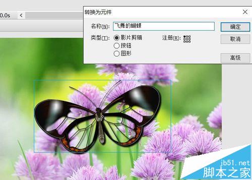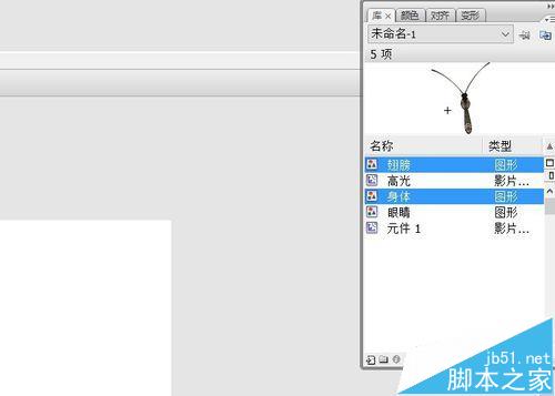 2、ctrl+F8,新建一個影片剪輯元件。取名蝴蝶。將身體元件拖入。
