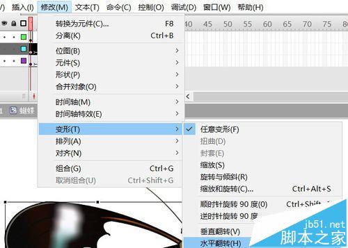 8、分別對幀1、10和20,修改——變形——水平翻轉,將該層上的翅膀翻轉成另一半。
