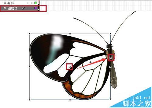 3、圖層2,拖入翅膀元件,放置在身體合適位置。變形點放置在身體一側。