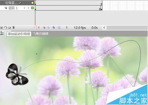 4、新建引導層,線條工具,繪制一條折線,選擇工具拖動,使其成為曲線,起點在蝴蝶位置,終點在花上。