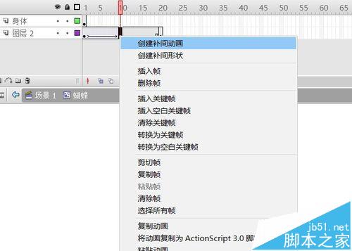 6、分別為幀1、10創建補間動畫,方法:右鍵——創建補間動畫。