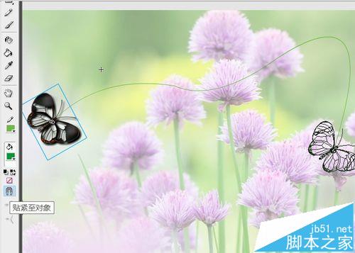 5、點蝴蝶層,點上貼緊至對象,將最后一幀蝴蝶移至線條終點處,使變形點與線條相合,并旋轉到合適位置。