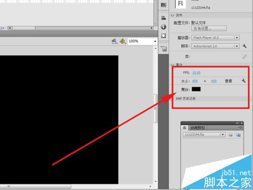 2、找到屬性窗口,修改編輯區的大小為800*600像素,幀頻為15fps,背景色為黑色。