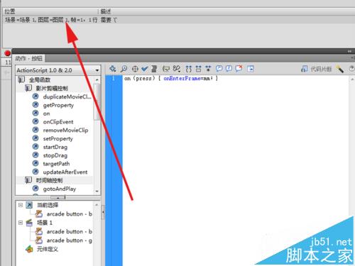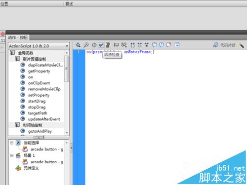 6、選擇舞臺上的arcade button - blue按鈕,同樣方法打開動作面板,接著在動作面板中輸入代碼:on(press){ onEnterFrame=mm;},點擊語法檢查,查看是否有編譯錯誤。根據錯誤修改代碼內容。