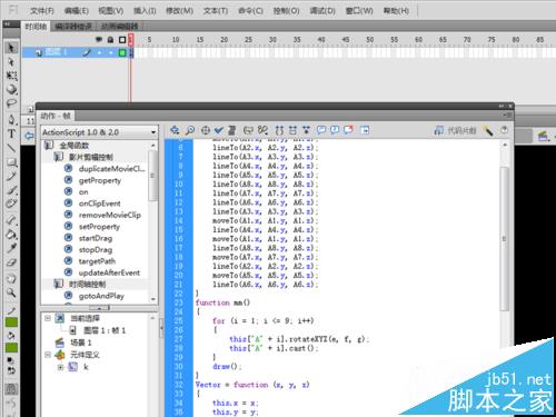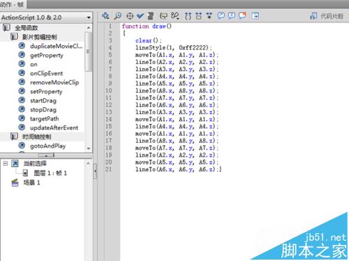 7、選擇圖層1的第一幀,右鍵單擊從下拉菜單中選擇動作,打開動作面板,在該面板中輸入代碼,一段關于畫圖的函數代碼。