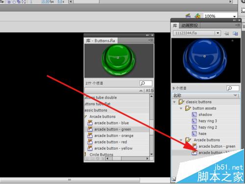 3、執行窗口-公共庫-按鈕命令,在彈出的公共庫窗口中找到classic buttons文件夾,在該文件夾中將按鈕arcade button - green和arcade button - blue拖拽到庫中。