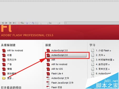 1、啟動flash cs5,執行文件-新建命令,在彈出的窗口中選擇新建一個基于actionscript2的flash文檔。