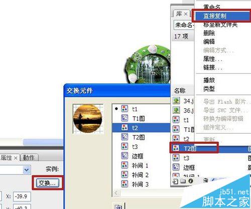 8、庫中選中圖1圖形元件,右鍵直接復制兩個,分別改名為圖2圖、圖3圖。雙擊圖2圖進入編輯,選中圖1元件,屬性面板中點交換按鈕,改為圖2元件,可以將相框剪切后原位粘貼到另一個圖層,方便對圖片的選取。圖3圖同樣處理。