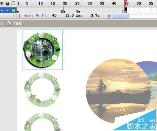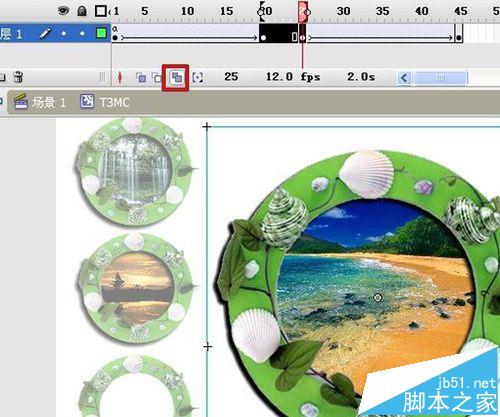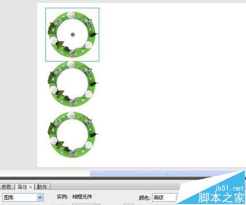 15、相框層下新建一層,庫中拖入三個圖片元件,分別縮小后放至相框下方。完成制作。