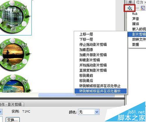 11、點擊T1MC,在行為面板中點擊添加按鈕,選擇影片剪輯——轉到幀或標簽并在此處播放。