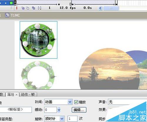 7、為第一幀創建補間動畫,旋轉選順時針。25幀創建補間動畫,旋轉選逆時針。幀1上寫上stop();