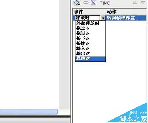 13、鼠標動作默認為釋放時,當然也可以點擊該處,在下拉箭頭處選取其他動作。為另外兩個MC作同樣處理。
