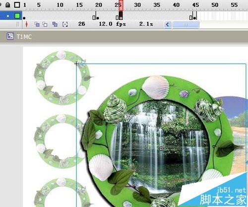 10、分別將T2MC、T3MC放至舞臺左側另兩個相框位置。雙擊進入編輯,點擊編輯多個幀,選中20——25幀處的元件放至合適位置。編輯多個幀可以對所選中的多個幀,同時進行編輯,如縮放、移動等,與PS中鏈接多個圖層類同。