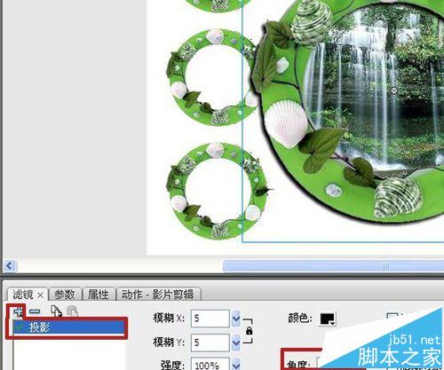 4、將相框元件拖入舞臺,放在一張圖片上,為相框添加投影濾鏡。鎖定其他圖層,框選圖片與相框,F8轉換為圖形元件。