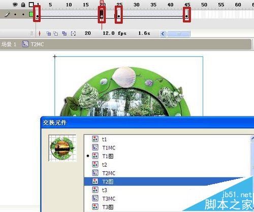 9、同樣復制兩個T1MC,將其中每一個關鍵幀上的元件更換。如圖。