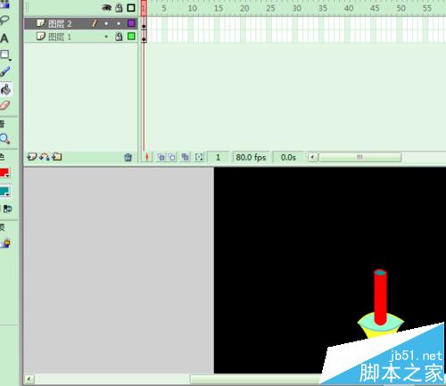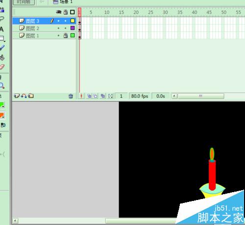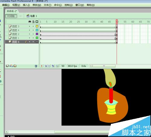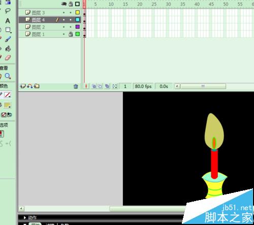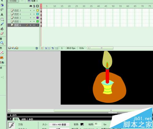 用FLASH軟件模擬蠟燭在微風下飄舞的動作,用到形狀補間動畫。
