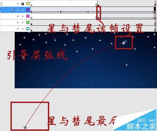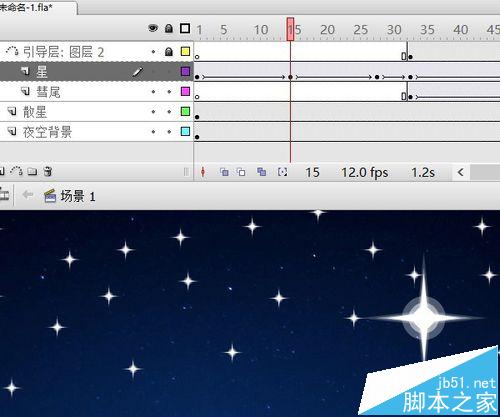 圖中的動(dòng)畫效果過程:舞臺(tái)底層添加一個(gè)夜空圖。把動(dòng)星元件拖入舞臺(tái),復(fù)制多個(gè),作為背景星。單選一個(gè)添加由小變大,再變淡、落下、變小的動(dòng)畫。然后添加一個(gè)彗尾,制作由短變長并隨其落下的動(dòng)畫,就成為星空流星劃過的景色。