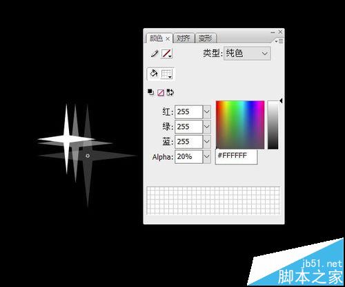 5、顏色面板中將層2星的Alpha值改為45%,層1的改為20%。分別將層2、層3的星垂直、水平居中分布,與層1的星重合。