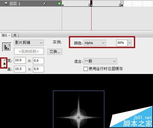 3、回到15幀,選中星元件,屬性面板中鎖定寬高,將寬改小,確定,星元件會(huì)同比例縮小。顏色欄選Alpha,數(shù)值改為30%。