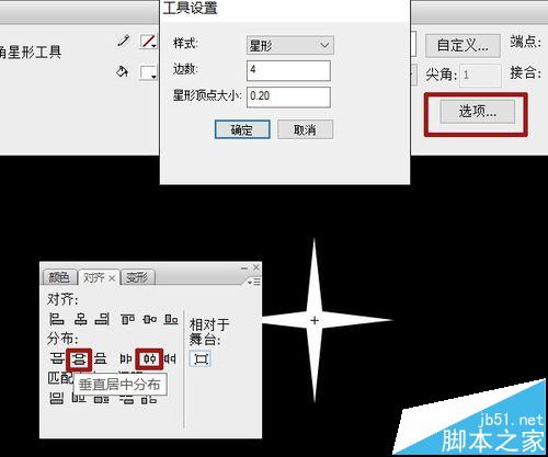 2、工具欄中選擇多角星形工具,屬性面板中點(diǎn)選項(xiàng),在彈出的面板中如圖設(shè)置。然后,在舞臺(tái)拉出一顆星,并將其寬度略縮。對齊面板中,選擇垂直居中分布、水平居中分布。
