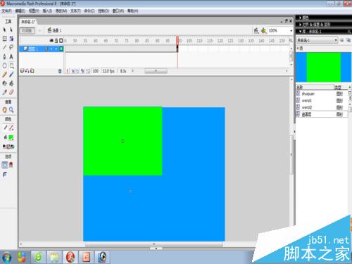7、回到主場景,將遮罩層元件拖入到舞臺左上角,在100幀處插入幀,隱藏圖層1.