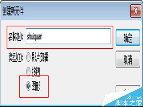 4、執(zhí)行插入-新建元件命令,名稱為wenzi1,類型為圖形,點擊確定進入編輯區(qū)域。選中文本工具,在舞臺上輸入豎排文字“落水文字”。