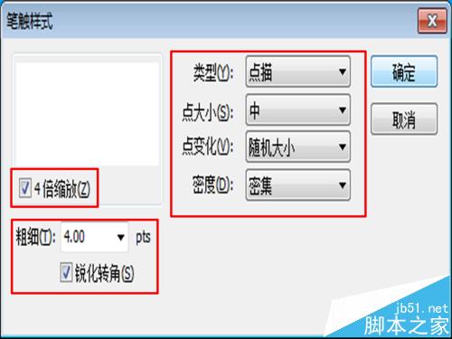 3、選中工具箱里橢圓工具,在屬性設置里點擊自定義,設置類型為點描,點大小為中,點變化為隨機大小,密集為密集,勾選4倍縮放和銳化轉向,點擊確定,在舞臺上繪制一個橢圓。