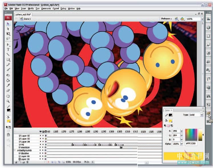 工具欄現在可以被定制成所有的工具排成一欄而不是兩欄。與以前一樣,你可以定制你的工作區的布局。下面是我的典型的設置,為設計工作留下了最大的舞臺空間。我喜歡用更寬敞的屏幕空來繪圖和制作動畫。事實上,我喜歡將分辨率設得盡可能的高,大部分時間我將我的17”的筆記本設為1920 x 1200的顯示分辨率。這將充許我工作在Flash舞臺上一個較大的工作格式,擴大到400%。我已經發現在用筆刷和線條工具繪制可產生更多的操作技巧。