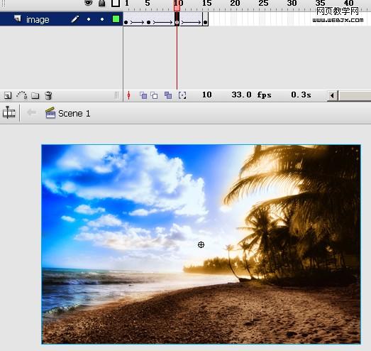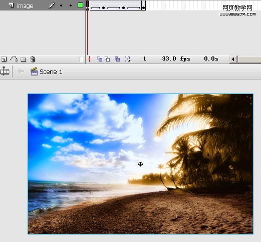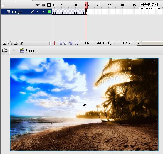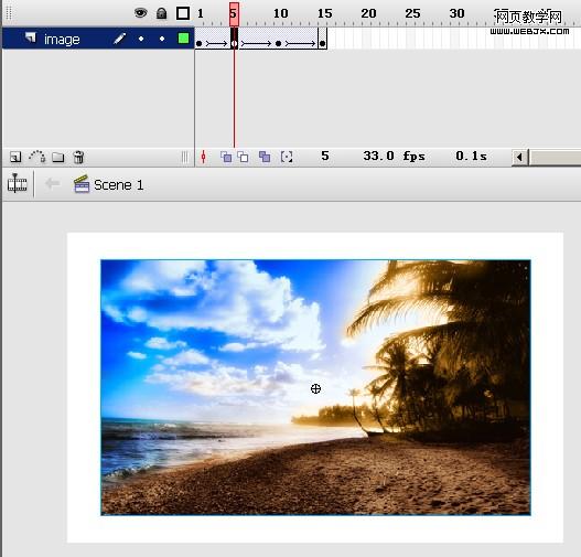 然后導入一幅圖片當做背景,我們首先把圖片轉換為影片剪輯元件,然后在該圖層中做放大縮小的動畫效果
