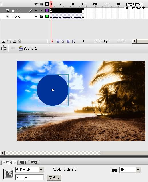 然后我們創建一個新圖層,創建一個圓,轉換為影片剪輯元件,命名實例名,然后設置為遮罩層,效果如下: