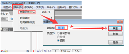 5、以上三種元件幾乎可以囊括flash動畫制作的所需的所有類型的素材,當然每種類型的元件并不是相互孤立的,他們彼此之間很多時候是相互聯系的。那么如何創建這三種元件呢,看如圖所示: