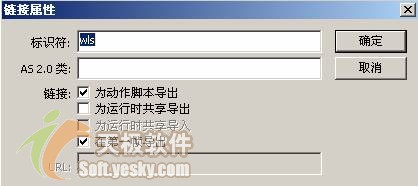 選擇菜單中的“文件” →“導入”→“庫”,將準備好的音樂導入進來, 在“庫”中單擊聲音元件 12.MP3 ,點鼠標右鍵,彈出菜單選擇“鏈接”,彈出“鏈接屬性”對話框,將“鏈接”里的“為動作腳本導出”與“在第一幀導出”打上勾,然后在“標識符“處輸入: wls   ,點“確定”。