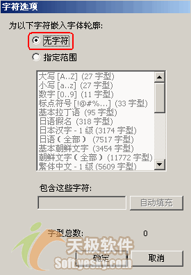 雙擊“庫”里的“長度”電影剪輯,選中圖層 3 ( layer 3 ),再點一下場景中的文本框,打開“屬性面板”,將“輸入文本”改為“動態文本”,將變量改為 cd ,按“字符”按鈕,彈出“字符選項”面板,選中“無字符”,點確定。