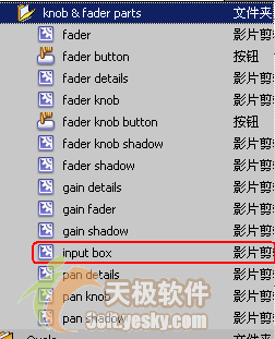 點擊“窗口” → “其他面板” → “公用庫” → “按鈕”,打開“ Knobs & Faders ”文件夾,找到電影剪輯“ fader - mixer ”,將其從“公用庫”中拖拽到自己的庫中的“音樂”文件夾內,將電影剪輯“ fader - mixer ”改名為“音量”,再雙擊文件夾“ knob & fader parts ”名稱,改名為“音量控制”,再雙擊該文件夾圖標,打開改文件夾,將影片剪輯“ fader ”改名為“音量手柄”,將按鈕元件“ fader button ”改名為“音量按鈕”,將影片剪輯“ fader details ”改名為音量刻盤,將影片剪輯“ fader shadow ”改名為“音量陰影”。