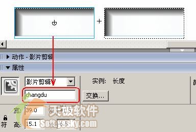 按下 Ctrl+F8 新建一個影片剪輯元件,起名為“文本”,分別將“長度”和“進度”兩個電影剪輯拖拽到“文本”電影剪輯的工作區里排列好,用箭頭工具點擊“長度”電影剪輯,到“屬性面板”中設置“實例名”為: changdu ,同樣方法設置“進度”電影剪輯“實例名”為: jindu 。