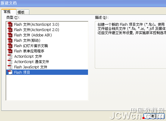 1、首先打開Flash CS4 (CS3、CS4或CS5沒什么大的區(qū)別)新建項目,按確定。打開項目面板。圖:新建項目、