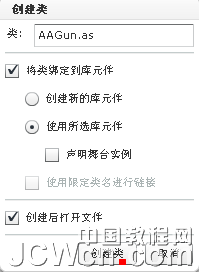 創(chuàng)建類的方法同第3步。首先選中庫中的AAGun元件,打開項目面板創(chuàng)建類。在"將類邦定到庫元件"前面打勾,點(diǎn)下"使用所選庫元件"的單選按鈕。圖:邦定庫元件