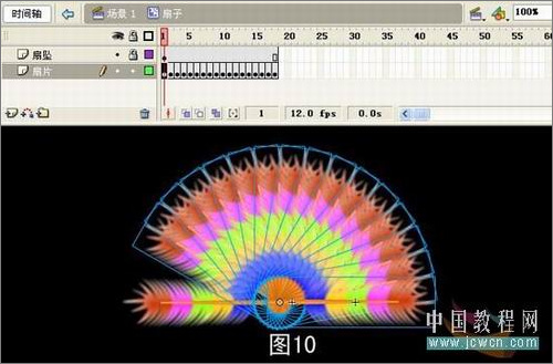 6、點選扇片圖層第1幀,把左邊第二片扇片元件按Delete刪除,然后用選擇工具框選除左邊第一片以外的所有扇片元件,保留左邊第一片扇片元件,選中第2幀方法同上不同處是保留左邊的第一、第二片扇片元件,依此類推,第18幀保留所有的扇片元件。如圖10: